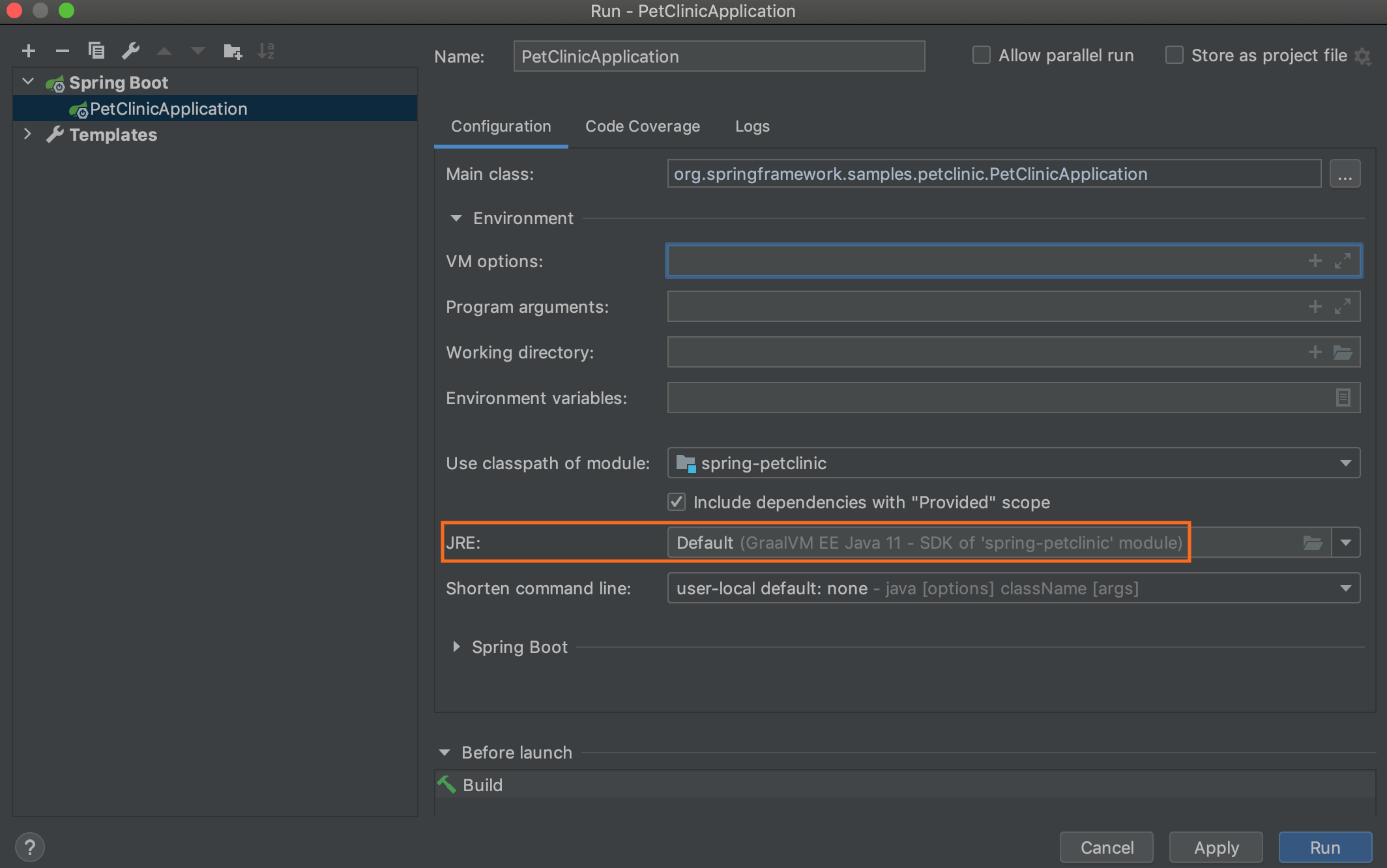 To run a Java project on GraalVM from an IDE requires setting GraalVM as a project’s default JDK. For example, to run the Spring PetClinic project using Intellij IDEA, you need to: